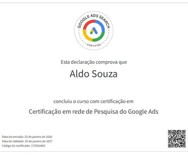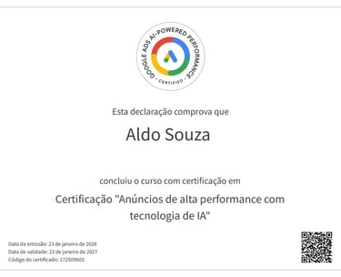 Aldo Lima de Souza, gestor de campanhas na plataforma Google Ads, com mais de 20 anos de mercado e atuação exclusiva em empresas de serviços locais e profissionais liberais que utilizam o telefone como principal canal de captação de clientes.